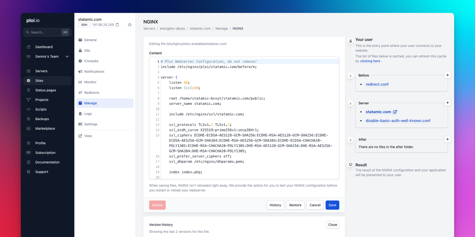 Ploi now automatically keeps a snapshot of the previous version of a configuration file every time you save it. They store the last three versions of each file, so you always have a safety net. You can preview any previous version in a modal, copy it to your clipboard or restore it to the editor with a single click.