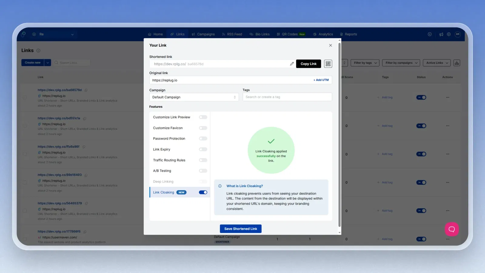 In other news, Replug has introduced a new link cloaking feature that allows you to mask your destination URLs while still maintaining your branding. It creates a seamless redirection layer that prevents users from seeing the actual destination URL. It displays destination content within your domain and preserves all tracking and analytics capabilities.