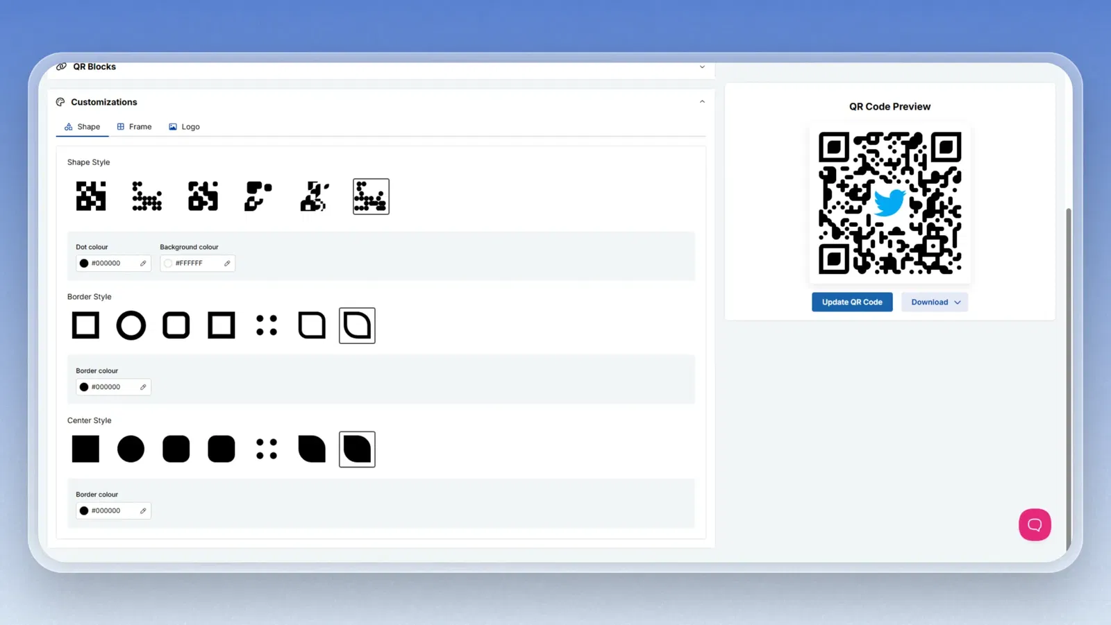 - Shape: You can customize dot styles, colours, borders and center patterns.
