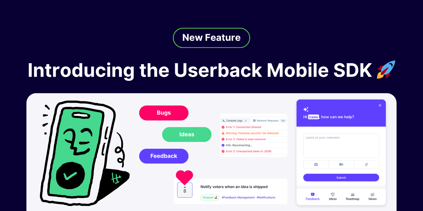 Enter the Userback Mobile SDK. Now, your iOS and Android users can submit bugs, ideas and feedback directly from your app, complete with automatically captured screenshots, console logs and network requests. All of this information flows straight into your existing Userback workflow, alongside your web feedback.