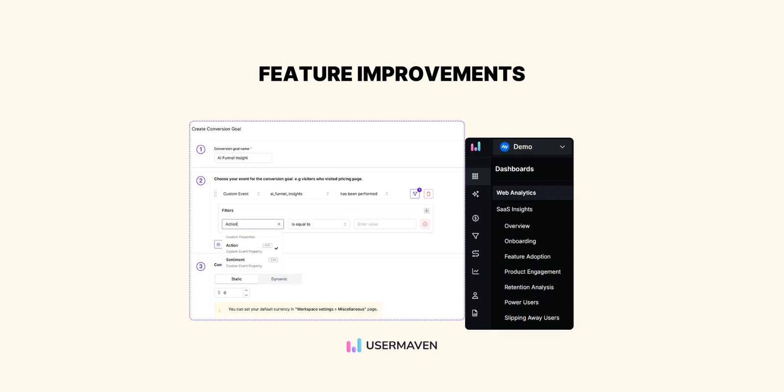 In other news, Usermaven now allows you to apply filters to your custom events, allowing for more precise tracking based on specific properties such as Checkout ID, currency and price. This allows you to create more targeted conversion goals with multiple conditions.